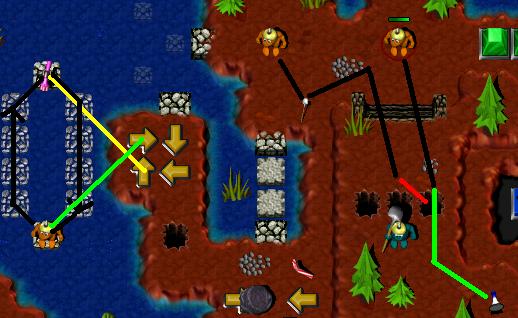 Take either of the two Crumbling Bridge pathz to the SpongeGun and wait there (patiently).When the proper time comez, your first target will be the Arrow (see the Yellow line), timed to arrive at the same time a teammate reachez it. Later, the same Grunt (now carrying a Gooberstraw ) will be assisted by 'friendly fire' (see the Green line). |