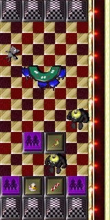 This is the most difficult part of the puzzle coming up, so SAVE! Take a moment to look around ... the only way to go is south. You see what awaitz you in Room #2 ... three enemy Gruntz ![]() ![]() !There is a Keg of Zap Cola There is a Black One-Time Switch (BOTS) probably needed to lower the two Black Pyramidz (BP).There is also a Question Mark Switch (QMS) blocked by the two BPz .There is a Toy that you will want to pick up ... and give away as a distraction.The most important thing you can see is a Picket Sign (CP).There is only one of you ... and three of them. There are also three Purple Multi-Grunt Switchez (PMGS).(Important, but they can wait until much later). Your real task is to place three Gruntz ![]() ![]() (you seem to be 'short' at least two!) onto three CheckPoint Switchez ![]() ![]() (CPS).You know how that Picket Sign works, right? Hold it, and one touch makez an enemy your friend. Time is also your enemy, you lose health with time ... gain health by making friendz. You want to avoid (as much as possible) getting hurt by "enemy action". Since you have to touch an enemy, you cannot avoid everything. The guy with the "bent piece of wood" is your biggest threat. Can you distract him?The next guy is weaker than you (right now), so you can handle him all by yourself. The third guy is furthest away, so is your least concern. Paddle over to Room #2, and past your main enemy (he waitz for you to stop).When he windz up to throw ... move! Pick up either the refreshmentz, or the Toy ... and move! Whichever you left behind is your next target. Pick ... and move! (Designer's choice ... refreshmentz .)Waddle over onto the CPS , and when he throwz, step onto the Landing Dock .Let him play with the Toy while you step on the BOTS and attack the weakest Grunt .No fair! He stole your Tool! Run for it (it, being the QMS )!Avoid any fighting, just head for the Picket Sign (perhapz down a little refreshment along the way). With sign is standing on the CPS and make him your friend .Run to the Grunt playing with the Toy, and also make him your friend .Finally, run to the last Grunt , and also make him your friend ."Hale-Bopp, here I come". Exit, stage left (Death #1). SAVE! (Unless that was so much fun you want to do it all again.) |