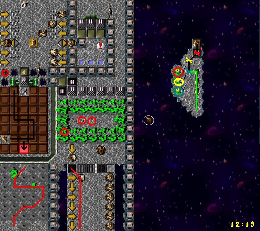 12 | 44 | The STT is an Arrow near the center of the Arrowz maze.The RW will open where the Grunt regainz control over where he goez next (ordinarily). This better be a Grunt skilled at hand-to-hand fighting! He landz near the three enemy Gruntz , and at least one of them will immediately attack.Do not move! Stand your ground and fight! Only when your enemy is a quivering puddle of Goo do you move to take on the next opponent.Repeat as often as necessary (or possible, depending on how quick you are with your handz). Then collect the goodiez ![]() ![]() the enemy Gruntz were guarding.If you survive to go through the return RW, you can complete the Arrowz maze and collect the Warp letter .Go through the last return RW if you must, but it is not necessary to the completion of the puzzle. |