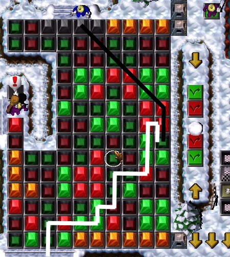 Bricklayer #3 layz a single Brick in the path of the RSB , breaking it. Gauntletz #2 breakz that Brick and standz on the GHS . Bricklayer #3 activatez the BOTS , lowering two nearby BPz ...and three more BPz surrounding a GruntCreationPoint !!!Then he putz the explosive Brick into his backpack.(You can enter Grunt #1 into the game now.)Both Gruntz cross the short bridge ![]() ![]() ![]() ![]() over Bad Water to the south. Gauntletz #2 breakz an Ice Crystal , expecting an attack. Nothing.So Gauntletz #2 breakz another Ice Crystal , expecting an attack. Still nothing.He movez toward a stack of Brickz and getz an explosive reaction from another Grunt.It seemz that stack had a 'sleeper' atop it, and was really . "Better him than me!"When the top Brick (the explosive one) was broken, the brick below it was destroyed .Gauntletz Grunt #2 movez to break the remaining Brick, but another enemy Grunt beatz him to it. "Ah. A little help here?" He headz for his buddy, and his buddy startz laying an explosive Brick. The explosive Brick is in place, and Bricklayer #3 stepz back a bit.The enemy Grunt is hot on Gauntletz #2's trail, and is blocked ... not for long.Boom! The expected happenz, and the enemy Grunt, the explosive Brick and the unbreakable Brick on top are gone, leaving a breakable Brick . Gauntletz #2 breakz that Brick and pickz up the Squeak Toy (Toy #5).He goez up and activatez the BOTS and pickz up the Coin (Coin #15) next to it.He antagonizez the last enemy Grunt into chasing him, and givez away the toy when the Grunt is standing on the PMGS .They then hurry down to the lowered BPz south of the stairway ![]() ![]() ![]() .Now all they have to do is find a path through the Red and Green Pyramidz. On the wide stairway, Bricklayer #3 layz a Brick in the path of the RSB , breaking it.Gauntletz Grunt #2 breakz the Brick , a small Ice Crystal , and three Giant Ice Crystalz.He revealz a Shovel and more breakable thingz ... and some diggable thingz. Bricklayer Grunt #3 sayz "That's the thing for me!" and pickz up the Shovel (Tool #9)