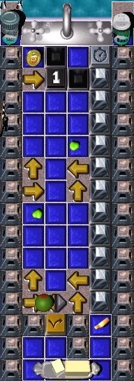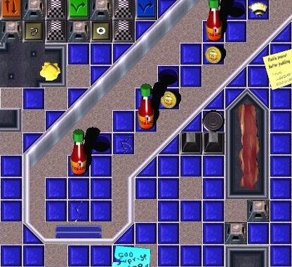 The SecretTeleporterTrigger is an ordinary tile near the southwest corner of the large griddle.The RW will open two tilez to the southeast. The RW will take you to the central corridor near a Yellow Toggle Switch (YTS) that will release a Rolling Olive .The grunt must win the race past the BOTS to pick up the Coin (Coin #6) and still get to the Silver Timer Switch (STS).Make it through the Silver Pyramidz (SP) to pick up the Warp letter and reach the return RW.Fly back to the Blue Hold Switch .