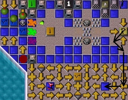 The SecretTeleporterTrigger is an ordinary tile surrounded by Arrowz, that may be reached when a grunt pressez a Question Mark Switch .The RW will open near three Rolling Olivez several tilez to the west ... which does not remain open long enough for the grunt activating it, to reach it!The RW will take the grunt (who should be carrying a Shovel ) to the small island where there is a Warp letter buried in a Mound . |