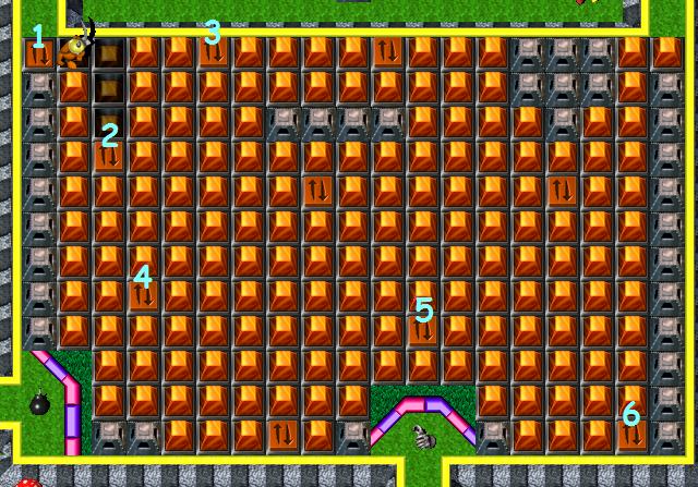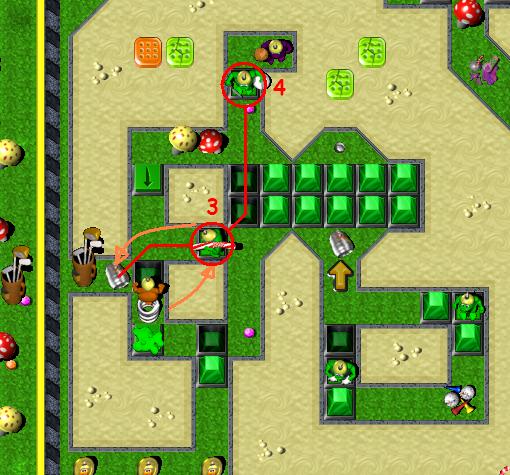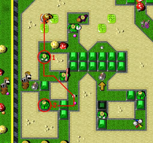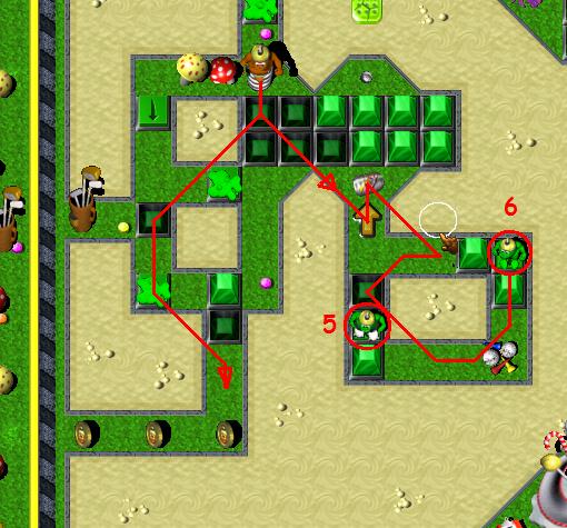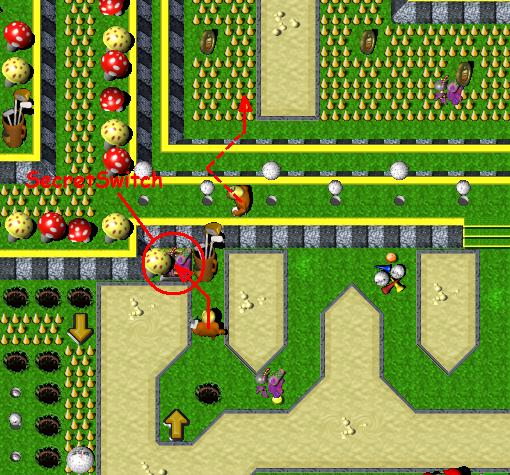 Break mushroom at the bottom, under which a timebomb is hidden. It will blow up every mushroom it that area. Then, break next three mushrooms to the right and pick up a coin. Go to the top, where enemy GauntletzGrunt is. Hold on few seconds, and break mushroom in front of you. Result should be destroyed RedBrick. Enemy will keep destroying brickz and make you way to the the GreenToggleSwitch. Kill BoxingGlovezGrunt, press a switch and pick up a coin. Now, get back to the set of six bricks in the middle. Break those bricks in following order: