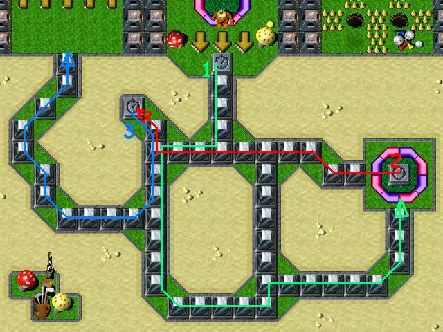 With your WingzGrunt step onto a OrangeSwitch, to set SpongeGunGrunt free. Then, WingzGrunt flies to the GreenHoldSwitch ( try to choose as shortest way as possible ) and stays there. Switch to the SpongeGunGrunt. Knock two SwordGruntz into a holez. When enemy GauntletzGrunt will sense you, step back and let him smash that mushroom up ahead. When he will be done - knock him as well. Go to the north, and pick up Gauntletz ( watch out! There is a popping up golfing ball beneath! ). Smash mushrooms and destroy brickz. Then - equip a Shovel and go to the GreenHoldSwitch. Now, let your WingzGrunt join him. Replace ShovelGrunt with WingzGrunt on a GreenHoldSwitch. Now, hit the last CheckPoint with your ShovelGrunt. Dig up a hole in the middle and press OrangeSwitch. Now, WingzGrunt picks up a Bomb and blows up mushrooms at the bottom. Now, ShovelGrunt digs up another hole, close to the pink SwordGrunt, and picks up a Pogo-Stick ( and, of course, presses RedToggleSwitch ). Give it to enemy and dig up the last hole. Take Gauntletz and break mushroom at the top-left corner. There is MagicScroll hidden. Cast your freezing spell, kill three enemies, and break last mushroom ... there is WarpStone piece! Give it to the king and ... that's all!