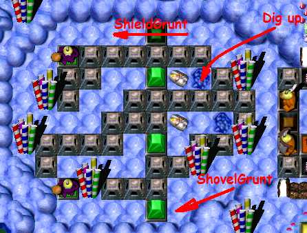 Switch to BarehandedGrunt. Go through candles area, kill ShovelGrunt ( by squashing him by arrowz ) and, of course, take Shovel. Go down and take ZapCola. Dig up hole next to stairs, press Orange Switch, then go the west. You have to dig up second hole with coin. To do it, fill in two holes, and when candles will hide into ground, go dig up hole. Now - join to ShieldGrunt. In iron maze to the west, dig up one hole. ShovelGrunt goes bottom way, ShieldGrunt goes top way. To kill ClubGruntz, you need to wait for ObjectDropper - when it is close to you, step next to enemy and go back ( one full loop around map takes 43 seconds ). Dropped present will squash him!