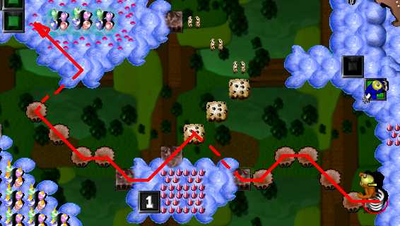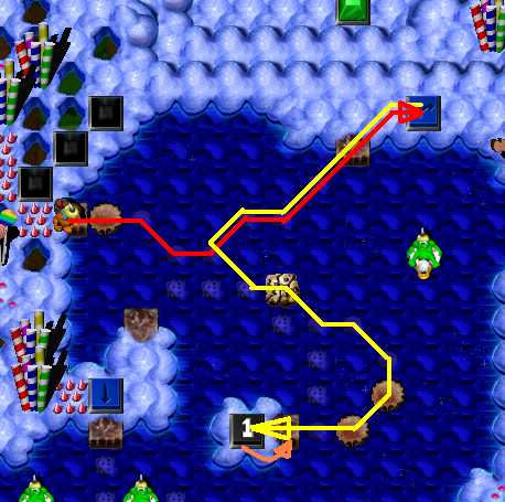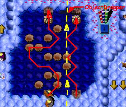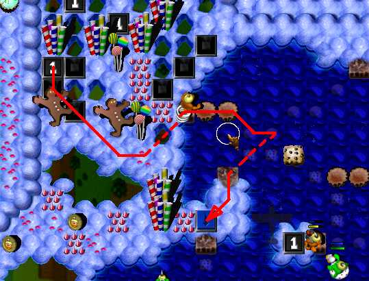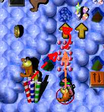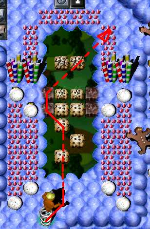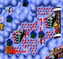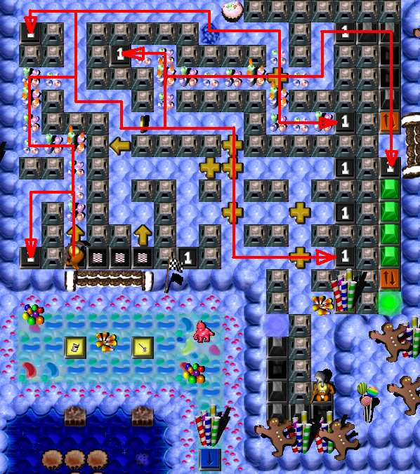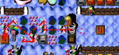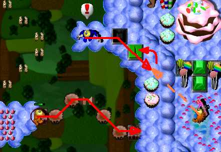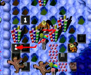 Complete the maze. Now it's time to pass area with enemy SwordGruntz! So far, you are able to pass only 3 of 5, because your health is low then. Do it. Now switch to ShovelGrunt. Pass arrow maze and go to place in the middle, with candles. You have to fill in hole to the west to pass. After that, dig up hole to the east. Beneath it is placed time bomb, wich will blow up cupcakez around it. It will make you pass to BONUS arrowz, leading up to coin. Beneath the hole at end of the arrow maze is coin. Dig it up. Then go through toggling bridge. You have to dig up 2 holes. Beneath left one is Blue Switch & TIME BOMB, so when it's going to explode, step to the right on the toggling bridge! Beneath right one is MagicScroll. This one is casting health spell. Go to the north as closest as possible to ShieldGrunt and then - cast spell. Switch to ShieldGrunt: go next to two SwordGrunt, BUT DO NOT TAKE ZAPCOLA YET! Behind Green Hold Switch is fake candy - go through it and take coin. Now take ZapCola and press Green Hold Switch. Switch to ShovelGrunt. To the east are two holes: right and bottom. There is nothing beneath right one, so go to the bottom one. When hole will be digged up, GO BACK, beceause you have to fill in hole, you have just digged up ... Pick up coin. Now it's time for toggling bridge maze to the north. In picture below is shown way to solve toggling bridge maze. Watch out! There is flying ObjectDropper throughout this area!