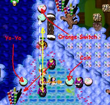 The last BombGrunt ( white dotted line ) has to be delayed with yo-yo and forced to blow up last cupcake with Orange Switch beneath. Step on it.