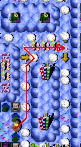 SpongeGrunt goes to the area with green BombGrunt. Do not attack him! Now switch to SpringzGrunt. He has to return the same way he came in. Watch out! There will be a moment, where candles will light on & light off in a little space of time. Then you have to jump towards second candle exactly, when it is going to light off. He takes SuperSpeed Powerup and goes to the RollingBalls maze. There are few ways to pass; in picture below I have showed one of them.