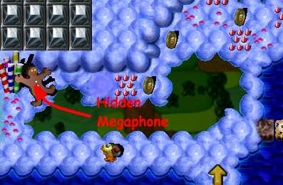 He presses Black One Time Switch & Silver Timer Switch and passes pyramids maze. Finally takes Megaphone. Now switch to SpongegunGrunt. Place SqueakToy from Resourcez in the place in picture below and force green BombGrunt to blow up cupcake with Orange Switch & Shield beneath. Take it and press the switch.